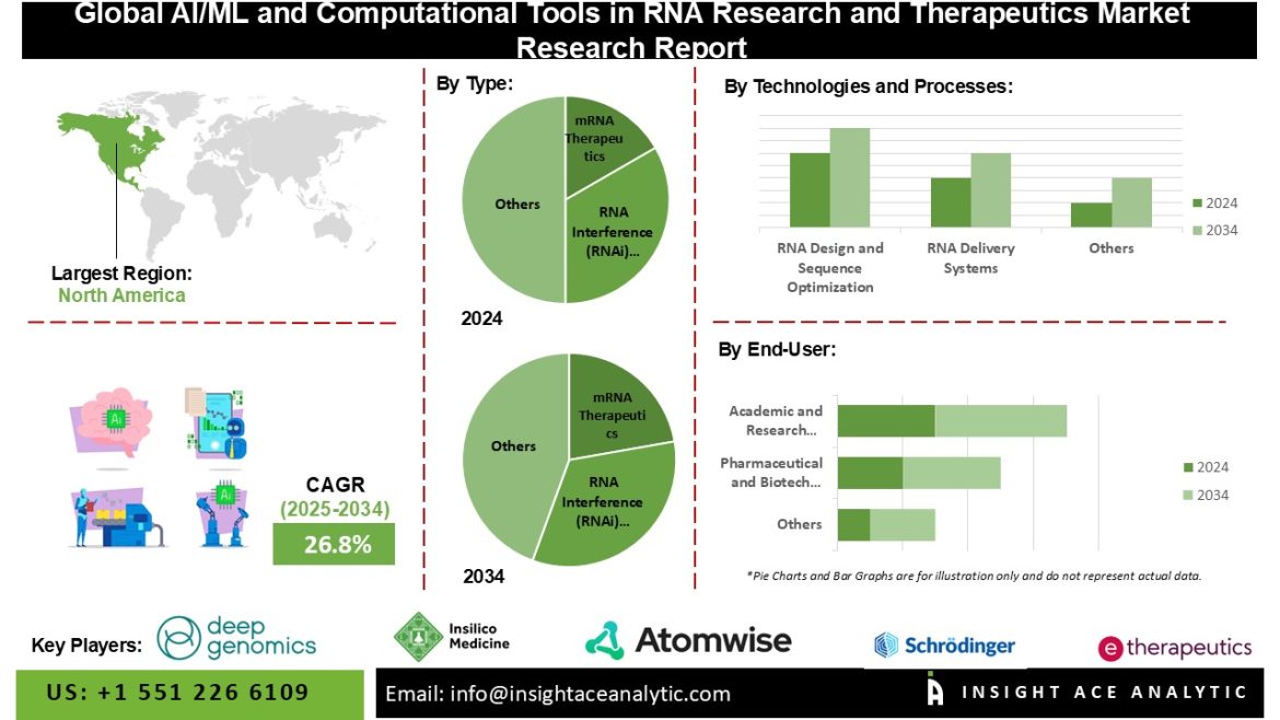 InsightAce Analytic Pvt. Ltd. announces the release of a market assessment report on theGlobal AI/ML and Computational Tools in RNA Research and Therapeutics Market Size, Share & Trends Analysis Report By Technologies and Processes (RNA Design and Sequence Optimization, RNA Delivery Systems, RNA Sequencing and Data Analysis, Target Identification and Validation, Preclinical and Clinical Development Tools, Hardware and Infrastructure Support), Product (Vaccines, Drugs), Type (mRNA Therapeutics, RNA Interference (RNAi) Therapeutics, Antisense Oligonucleotide (ASO) Therapeutics, Other Therapeutics), End-User (Pharmaceutical and Biotech Companies, Academic and Research Institutions, Contract Research Organizations (CROs), Healthcare Providers (Emerging))- Market Outlook And Industry Analysis 2034″