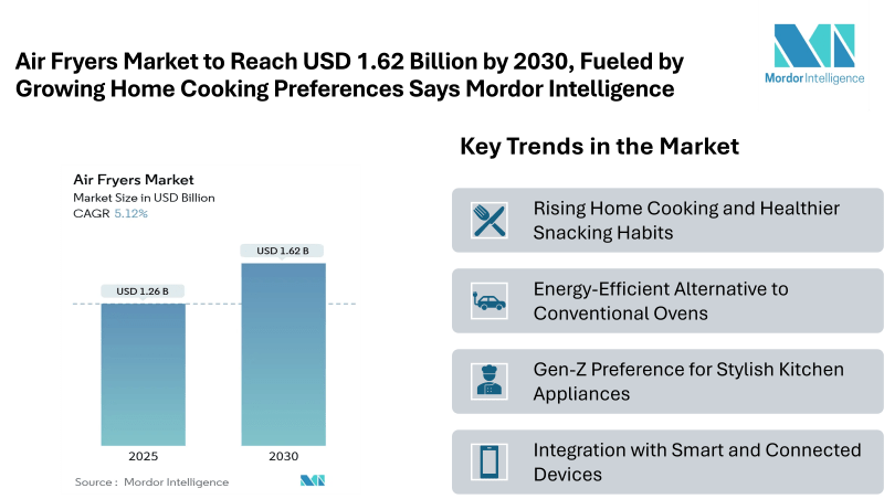 According to Mordor Intelligence, the global Air Fryers Market size stood at USD 1.26 billion in 2025 and is forecast to advance at a 5.12% CAGR, reaching USD 1.62 billion by 2030. The Air Fryers Market share is increasingly influenced by product innovations, including rapid-heat technology, PFAS-free coatings, and smart-home connectivity.