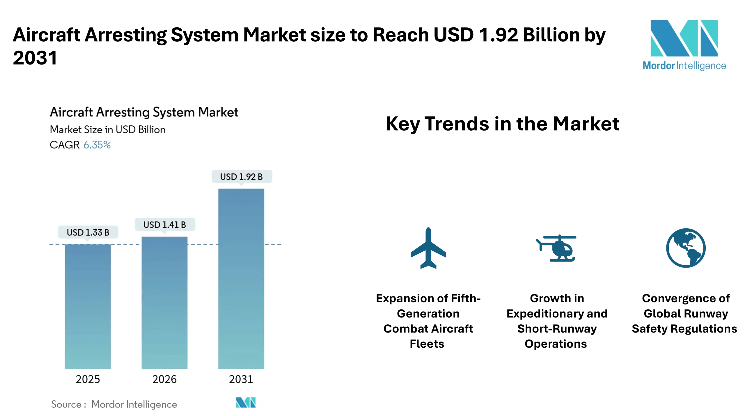 According to Mordor Intelligence, the aircraft arresting system market size was valued at USD 1.41 billion in 2026 and reach USD 1.92 billion by 2031, registering a CAGR of 6.35% during the forecast period. The aircraft arresting system market size is supported by rising investments in advanced fighter aircraft, aircraft carrier modernization programs, and stricter runway safety requirements across commercial airports.