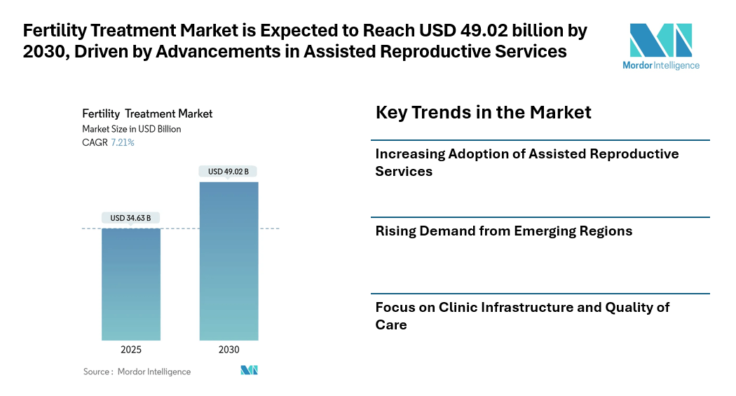 The fertility treatment market continues to gain attention as rising infertility rates, increased treatment awareness, and wider availability of assisted reproductive services support long-term market expansion. According to the Mordor Intelligence study, The fertility treatment market size is valued at USD 34.63 billion in 2025 and is forecast to reach USD 49.02 billion by 2030, advancing at a 7.21% CAGR, reflecting consistent demand growth across clinics, hospitals, and specialized reproductive centers.