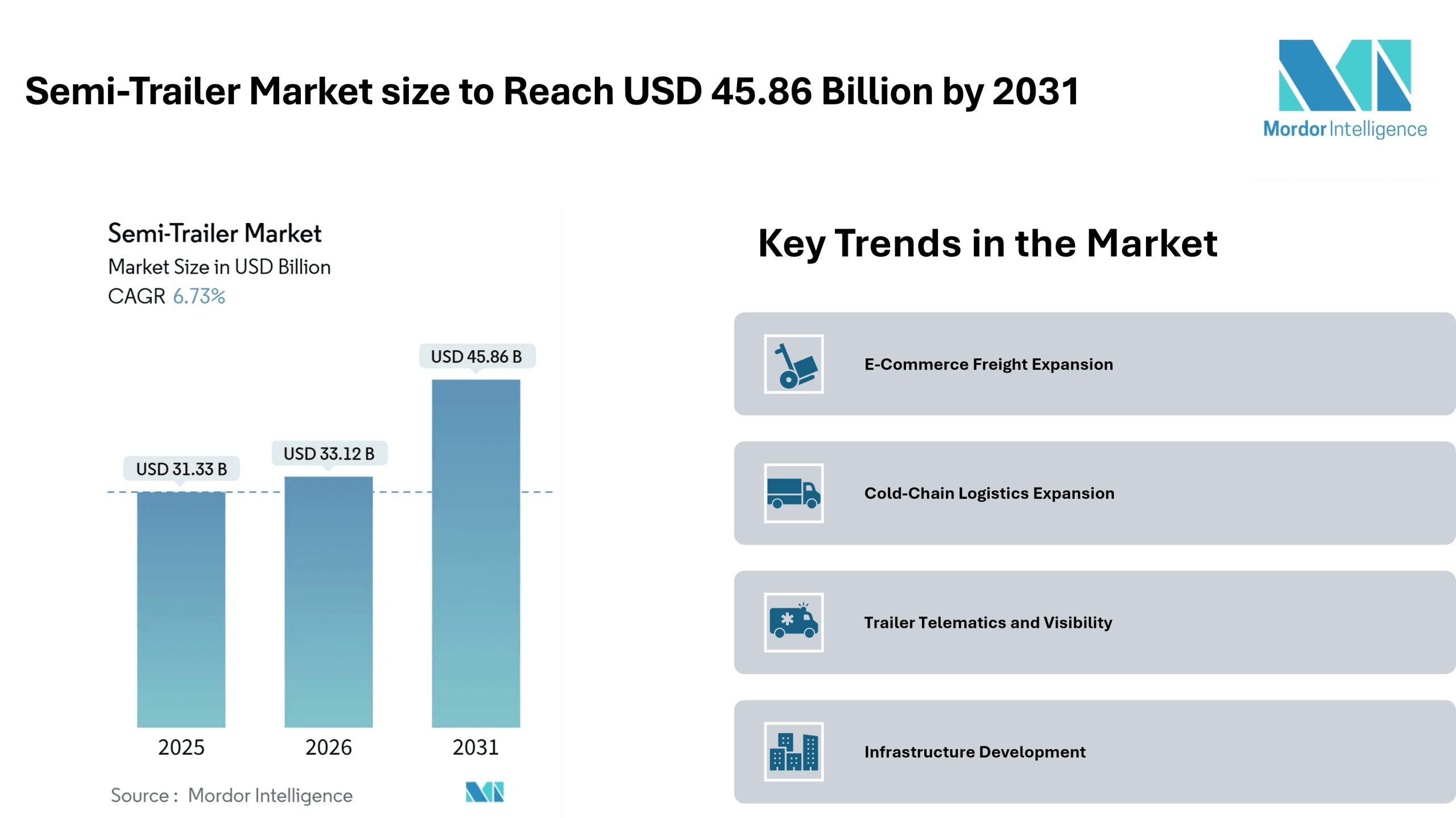 According to Mordor Intelligence, the semi-trailer market size is projected to grow from USD 33.12 billion in 2026 to USD 45.86 billion by 2031, reflecting steady semi-trailer market growth during the forecast period. The semi-trailer market forecast highlights sustained demand across logistics, cold-chain transportation, and infrastructure-linked freight movement.