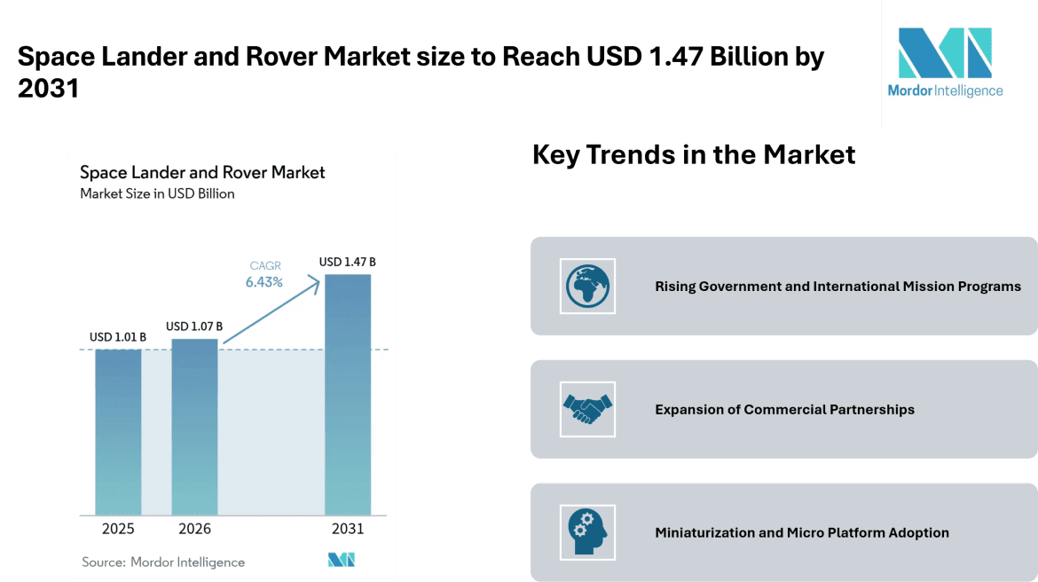 According to Mordor Intelligence, the space lander and rover market size is projected to grow from USD 1.01 billion in 2025 to USD 1.07 billion in 2026, and further reach USD 1.47 billion by 2031, registering a CAGR of 6.43% during the forecast period. This upward trajectory highlights consistent market growth, supported by long-term exploration programs and steady funding pipelines.